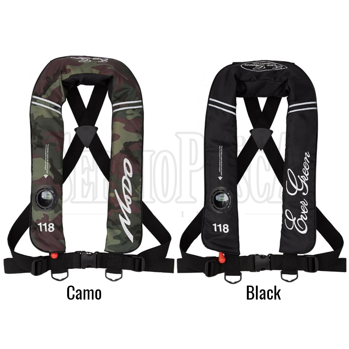 L'Inflatable Jacket Type 4 della Evergreen è un giubbino di salvataggio di altissima qualità. Utilizzabile sia dalla barca, che dalla riva, possiede un design semplice, ma efficace con la scritta Evergreen davanti ed il logo nella parte posteriore. Non interferisce assolutamente nell'azione di pesca, ma rende l'azione di pesca sicura. Possiede un eccellente resistenza all'usura, sul lato destro presenta una finestra rotonda che indica la funzionalità delle cartucce. Se sono verdi, significa che sono attive, se rosse vuol dire che non stanno funzionando. Molto comodo da indossare, aderisce perfettamente al corpo, protegge il collo in caso di caduta.