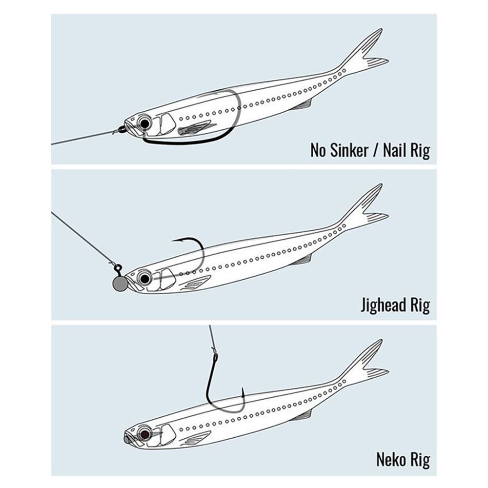 - Fenditura dorsale + punto guida ventrale: semplificano l'inserimento preciso di ami offset o jighead; il dot ventrale funge anche da guida per inserire nail sinker;