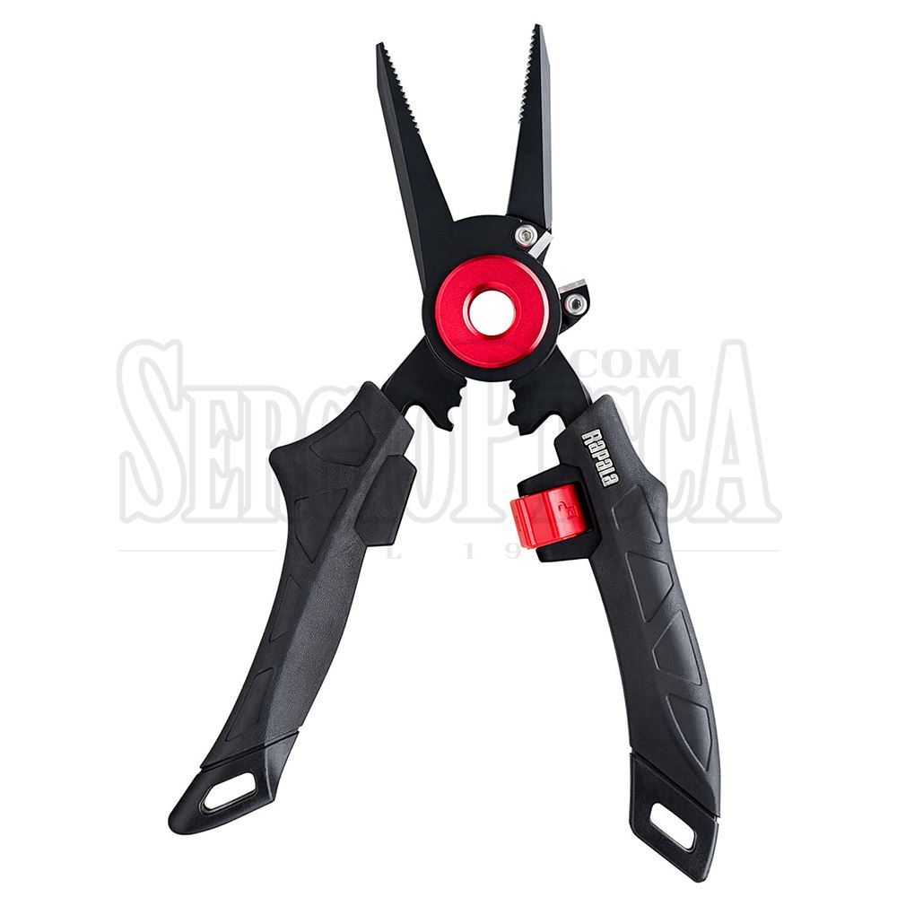 Rapala's RCD 7" Magnum Lock Pliers with Seath is a very sturdy pliers, constructed of stainless steel and coated with Cerakote® to offer additional protection against abrasion and corrosion. In the central part it features the "Reversible MagSpring" system which it locks the pliers in the closed position when not in use, while when used it acts as a spring to keep it open and ready for use. On the side there is a hard metal line cutter for braid, nylon and fluorocarbon. In the center it presents the system for crimpin. It's supplied with a practical seath and a spring with a special carabiner.