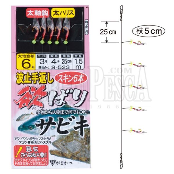 Il Sabiki S-523 della Gamakatsu è un sabiki composto da 5 ami di color oro con filamenti rosa che vogliono imitare dei gamberetti nella forma e nel colore, riuscendoci appieno.