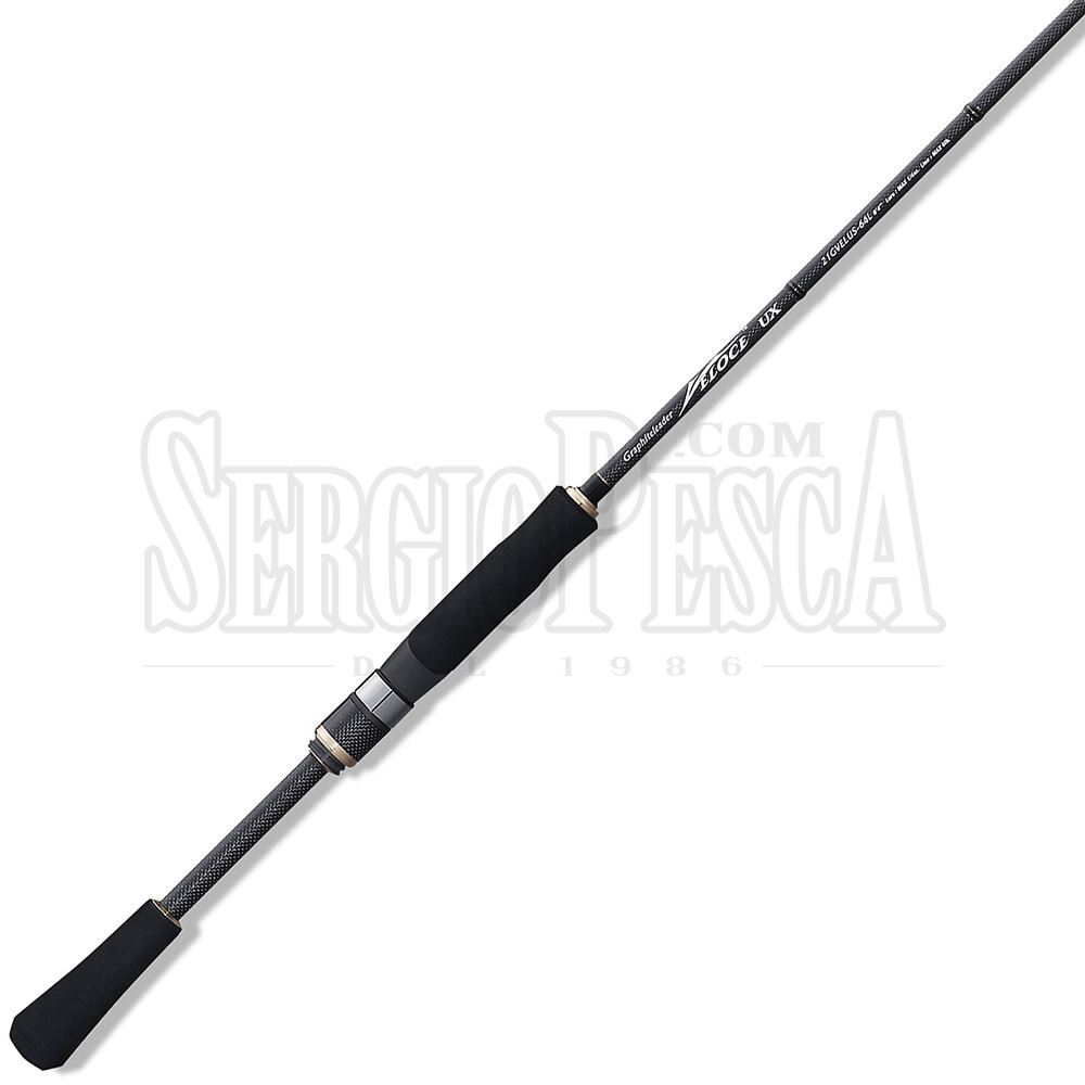 La Veloce UX Spinning Model della Graphiteleader rappresenta la nuova versione spinning di questa serie di canne da Bass Fishing. Il fusto di alta qualità in carbonio adotta il "Graphite Cloth LV" per la sezione del calcio, che consente di ridurre la torsione e lo schiacciamento, riducendo notevolmente il peso. Gli anelli utilizzati sono Fuji serie K con telaio in acciaio inox e pietra SiC-S, che garantiscono prestazioni eccellenti in termini di lancio e durata nel tempo. Il portamulinello è Fuji VSS, mentre l'impugnatura è splittata in EVA, che possiede un'elevata resistenza alla corrosione.