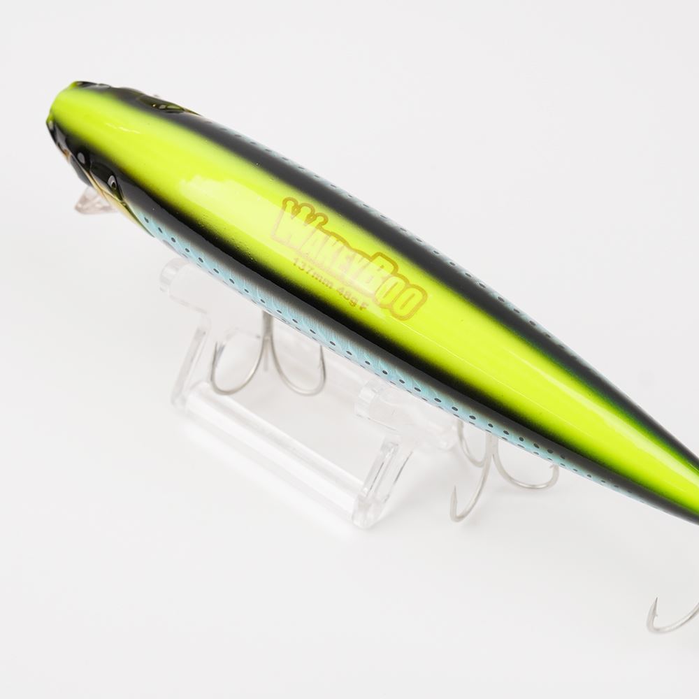 Il Wakey Boo 137 della Longin è la versione standard del Wakey Boo, una wake bait pensata per offrire prestazioni eccellenti anche con recuperi estremamente lenti. Ciò che caratterizza la serie Wakey Boo è un particolare corpo "fat" ad altissima galleggiabilità che genera una spinta d'acqua eccezionale, assicurando un nuoto naturale e visibile anche a velocità di recupero estremamente lente, una caratteristica unica nella sua categoria. Durante un recupero ultra-lento, il Wakey Boo si muove appena sotto la superficie con un movimento rolling sinuoso e irresistibile; aumentando la velocità, il suo nuoto si arricchisce di oscillazioni laterali (wobbling) fino a trasformarsi, con un recupero rapido, in un'azione ampia e vibrante (wide wobbling) che scatena gli attacchi dei predatori più aggressivi. Grazie al sistema interno di pesi mobili, progettato con estrema precisione, i contrappesi generano un suono sordo "gotogoto" simile a un rattle a bassa frequenza, che attira i pesci anche da grande distanza. Questa combinazione di richiamo acustico e azione dinamica rende il Wake Boo efficace in ogni condizione, sia in acque basse che su fondali più profondi.